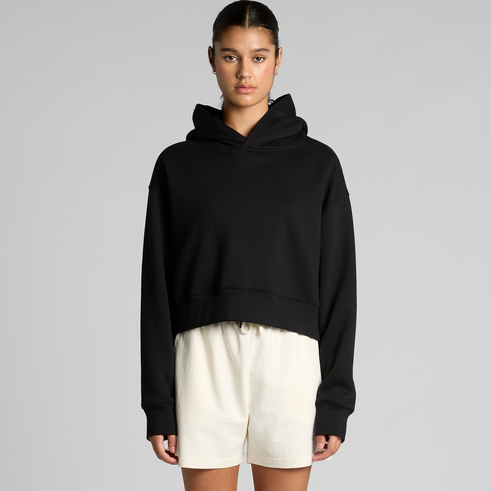 Construction: Pre-shrunk to minimise shrinkage, pullover hood, drop shoulder, cropped full length, self-fabric lined hood, no drawcord, sleeve cuff ribbing